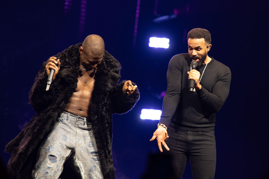London, England. 5th April 2025. Usher brings on stage another R&B legend, Craig David, on Saturday night at the O2